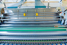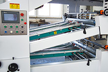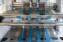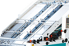底紙輸出部上下層底紙輸送均采用伺服電機(jī)與高強(qiáng)真空吸附相結(jié)合,確保瓦楞紙輸送精、準(zhǔn)、快。